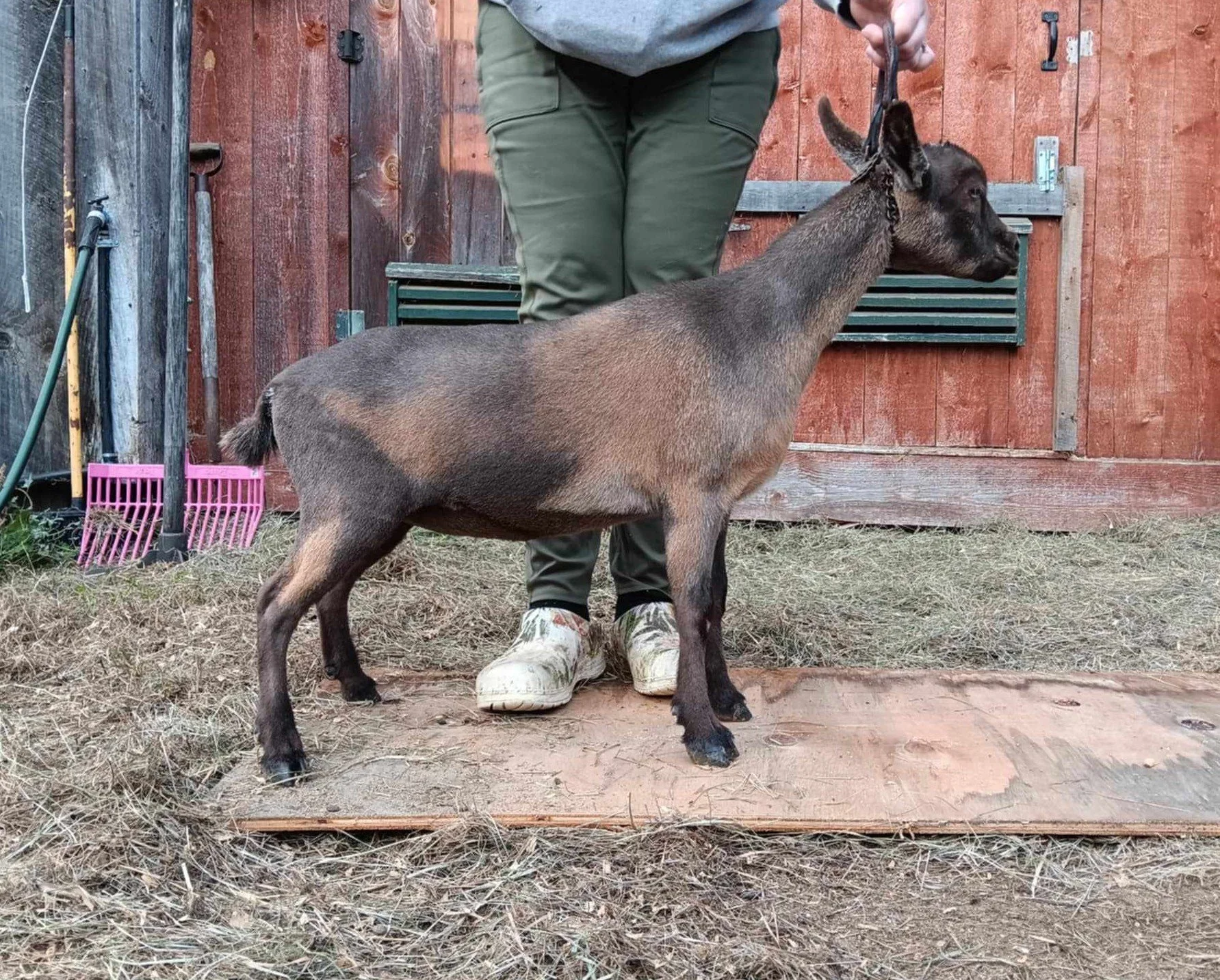 Appletini is another very promising doeling we had born this year! She is a SG Old Mountain Farm Bold Elk +*B granddaughter. She is very smoothly blended, level along her topline, strong feet, tight shoulders, great dairy neck and brisket extension. She is a beautiful doe that I have very high hopes for.